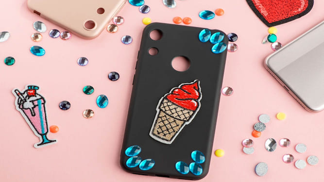 روش دیگری که در طراحی قاب گوشی محبوب است، افزودن عناصر سه‌بعدی مانند سنگ‌های تزئینی، نگین، مهره یا روبان‌های کوچک است.
